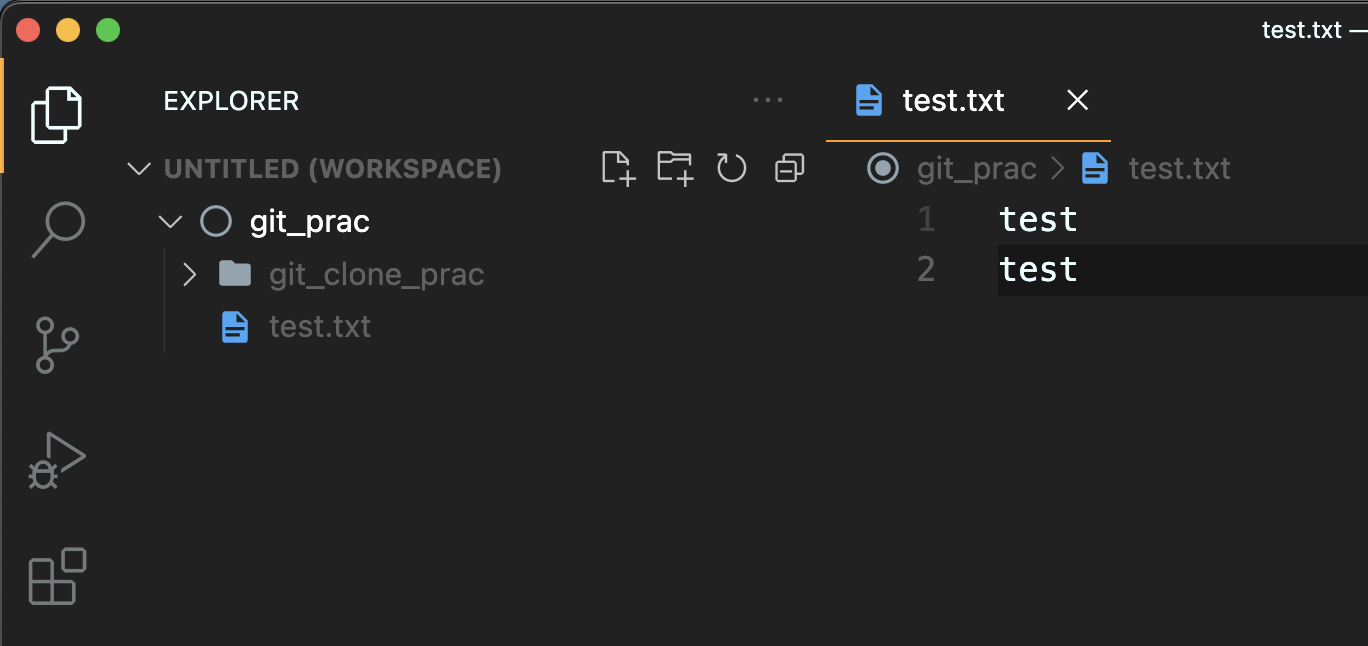 아래와 같이 git_clone_prac/git_prac(remote repo이름 디렉토리가 생성됨) 경로에 github에 올려놓았던 text.txt를 local로 가져왔다.