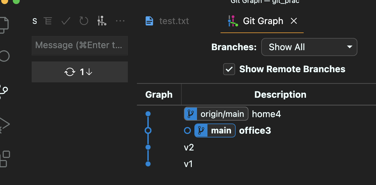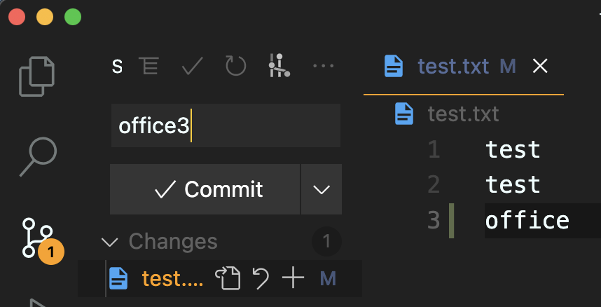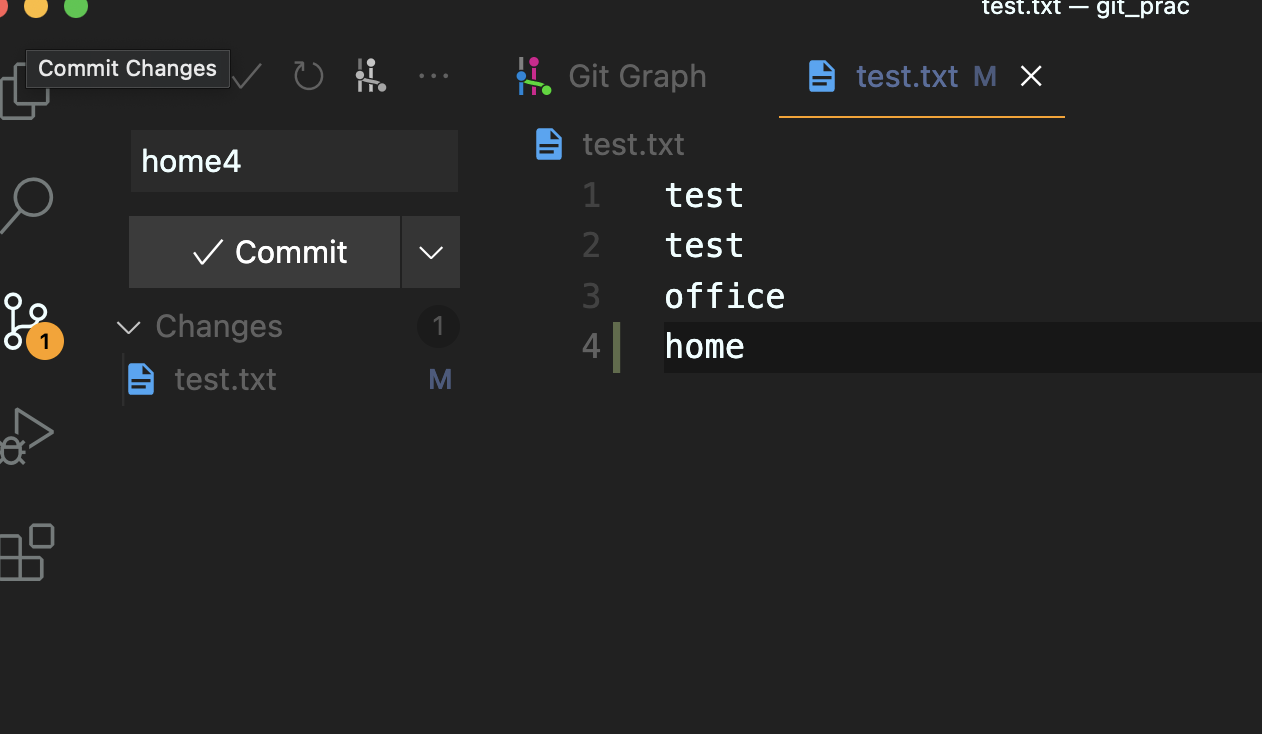왼쪽에서 test.txt를 수정해주고 commit을 해준다.
