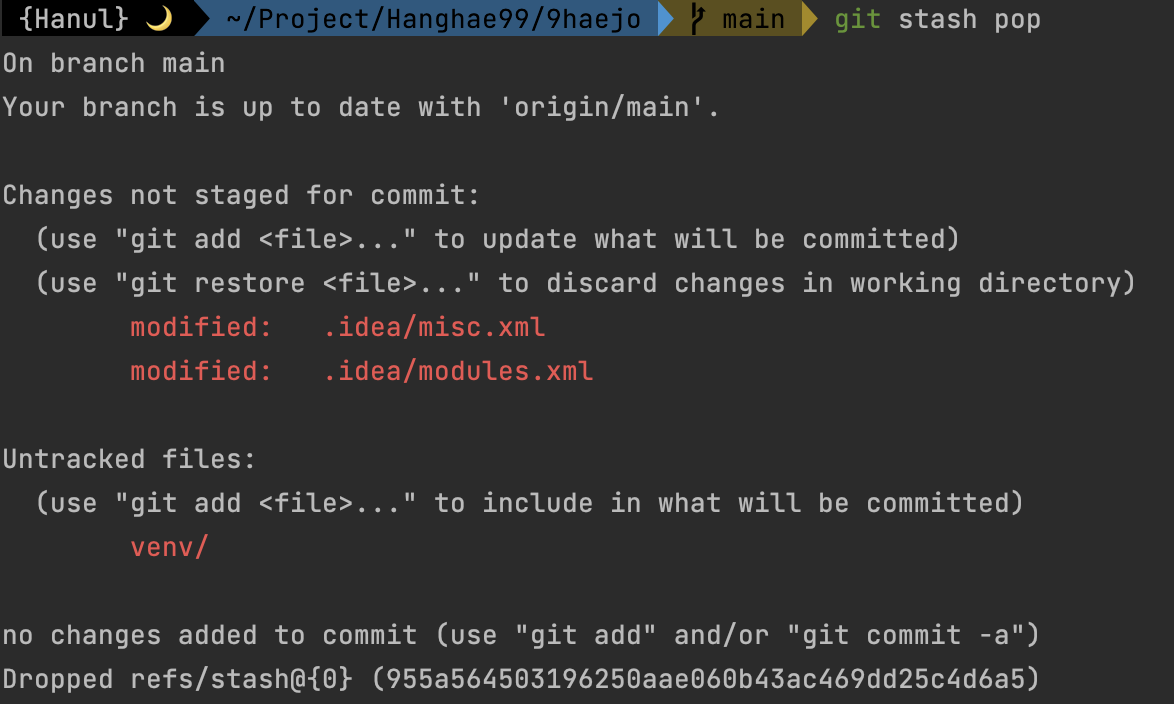 현재 브런치에 불러오므로 꼭 stash 했던 branch로 이동해 git stash pop을 해주자.